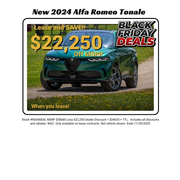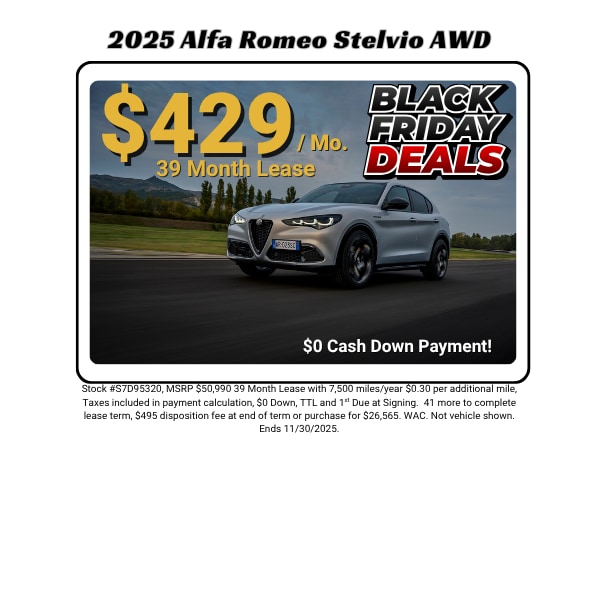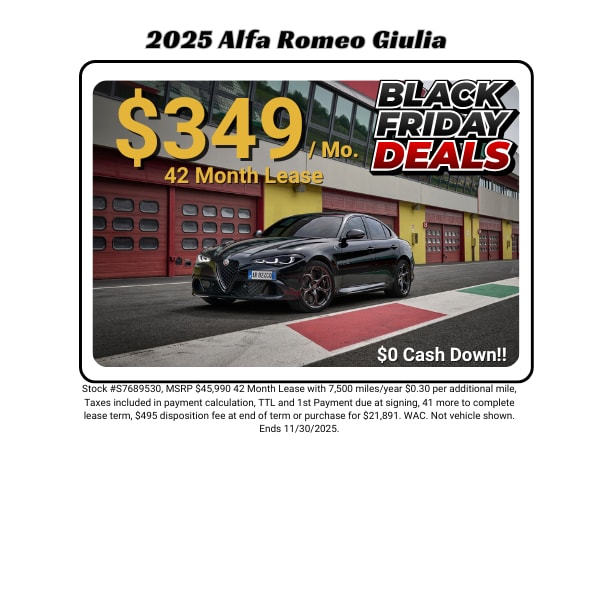 Luxury Vehicle Lease Specials in Houston! It's all about You!! What's the easiest way to Lease a New Alfa Romeo? A Sign & Drive Lease or A Low Down Payment Lease. How does it work? Easy... the payment shown for that particular vehicle may include taxes and fees and requires Low Down Payment -OR- No Money Down (some models, varies by inventory). Then, you simply enjoy your New Alfa Romeo. Want a different package car or color? No Problem. We can customize the Helfman Alfa Romeo Sign and Drive plan or Low Down Plan for just about any New Alfa Romeo in stock. So, come on by and take a test drive and see how easy and affordable it is to get into a New Alfa Romeo. We're right next to IKEA Houston on I-10. Super convenient to get to us, even from Katy, Sugarland, Pearland, Bellaire, and Tomball. No hassles, No rush, No fuss... just a great deal and amazing courtesy and service. So, come by and check out all our Low Down & Zero Down Lease Specials in Houston. All dependent on Lender Availability.
