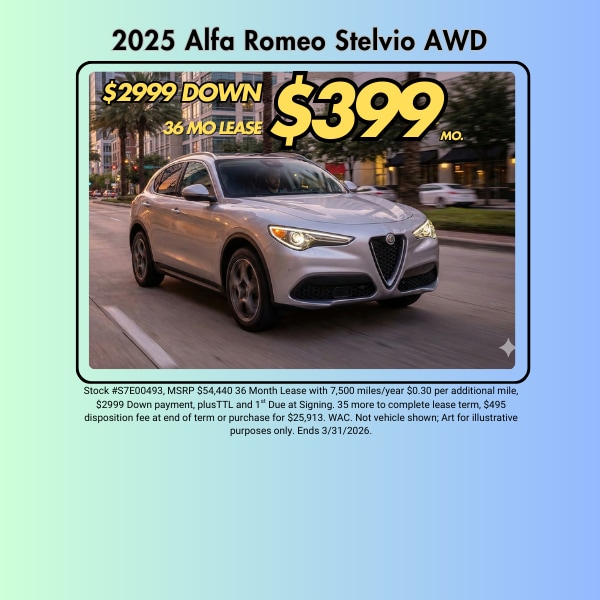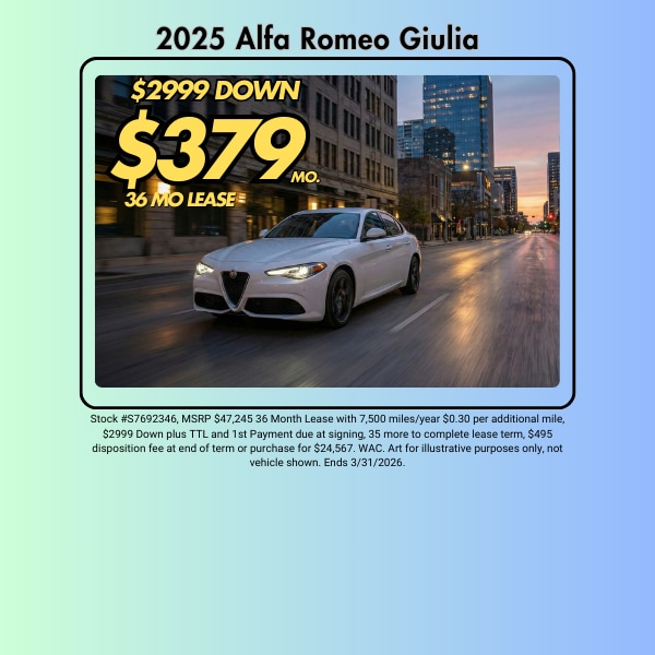 Luxury Vehicle Lease Specials in Houston! It's all about You!! What's the easiest way to Lease a New Alfa Romeo? A Sign & Drive Lease or A Low Down Payment Lease. How does it work? Easy... the payment shown for that particular vehicle may include taxes and fees and requires Low Down Payment -OR- No Money Down (some models, varies by inventory). Then, you simply enjoy your New Alfa Romeo. Want a different package car or color? No Problem. We can customize the Helfman Alfa Romeo Sign and Drive plan or Low Down Plan for just about any New Alfa Romeo in stock. So, come on by and take a test drive and see how easy and affordable it is to get into a New Alfa Romeo. Check out some Giulia Inventory Here. If you're interested in a Stelvio SUV, see that inventory Here. We're right next to IKEA Houston on I-10. Super convenient to get to us, even from Katy, Sugarland, Pearland, Bellaire, and Tomball. No hassles, No rush, No fuss... just a great deal and amazing courtesy and service. So, come by and check out all our Low Down & Zero Down Lease Specials in Houston. All dependent on Lender Availability.
